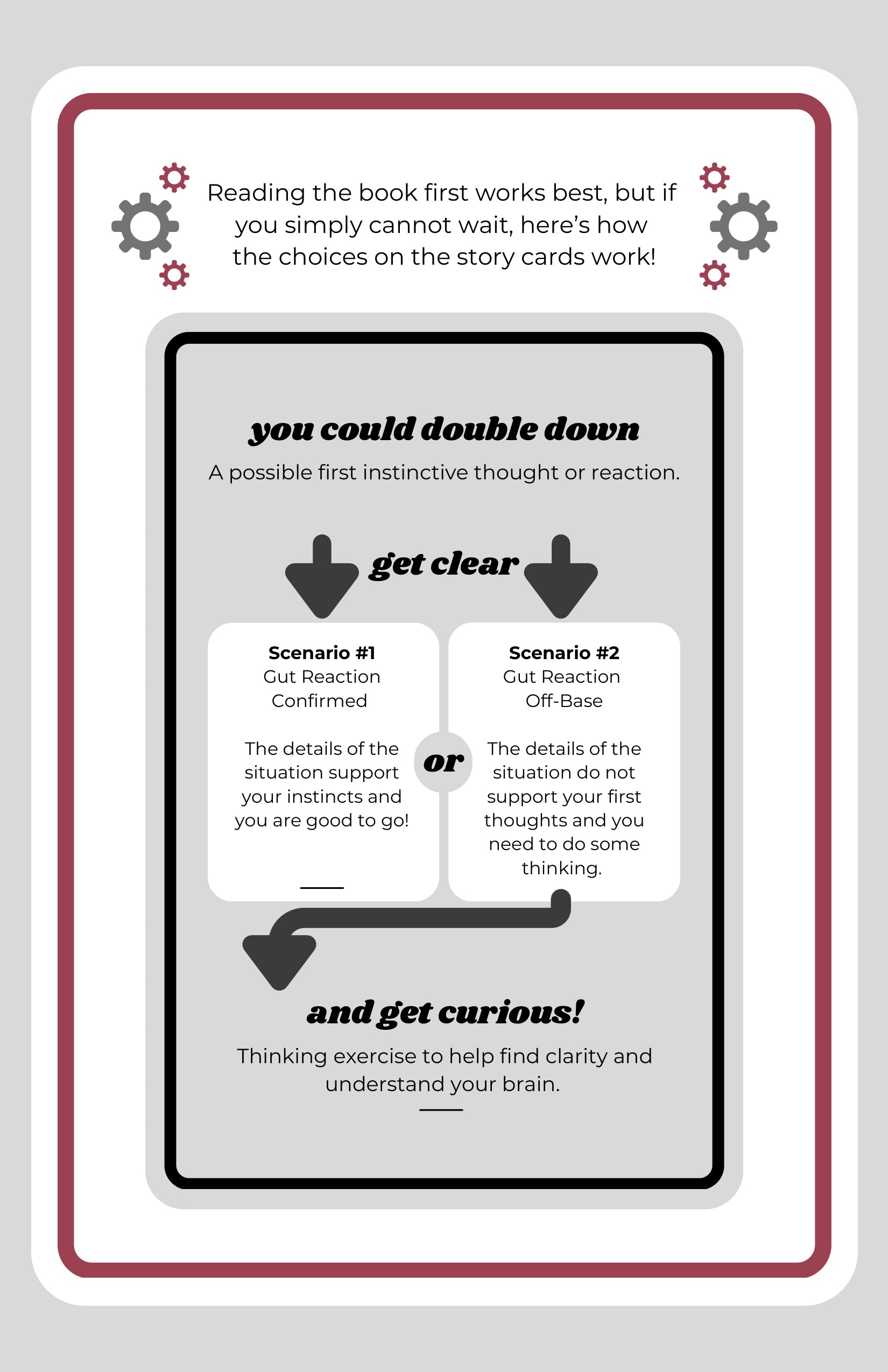 The story cards dive into everyday scenarios where snap judgments often occur. Think of it like a “choose your own adventure” for grown-ups. Each card presents a scenario and offers two paths—one where the snap judgment is justified (sometimes it is!) and one where it’s not. Then, we pose thought-provoking questions to help you think through scenarios where a snap judgment isn’t justified, so you can manage similar situations in your own life.